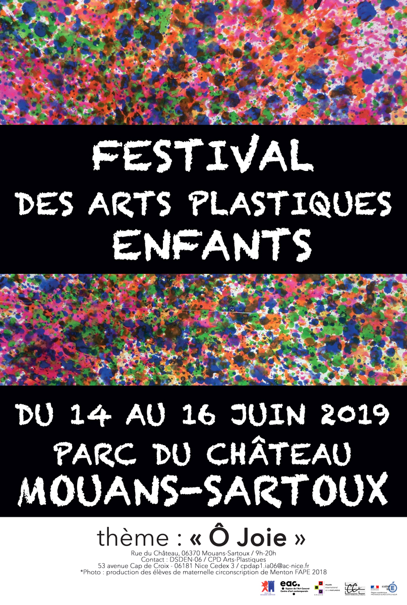 Le Festival d’Arts Plastiques Enfants est un projet départemental proposé par la DSDEN des Alpes Maritimes, la Mairie de Mouans-Sartoux, l’Espace de l’Art Concret, le MIP de Grasse et le Centre Culturel de Mouans-Sartoux. Le FAPE s’inscrit dans le Parcours d’Education Artistique et Culturelle permettant ainsi aux élèves d’avoir une expérience esthétique, artistique, culturelle et réflexive. Ce projet fédérateur en Arts Plastiques a pour thème : « Ô joie »!