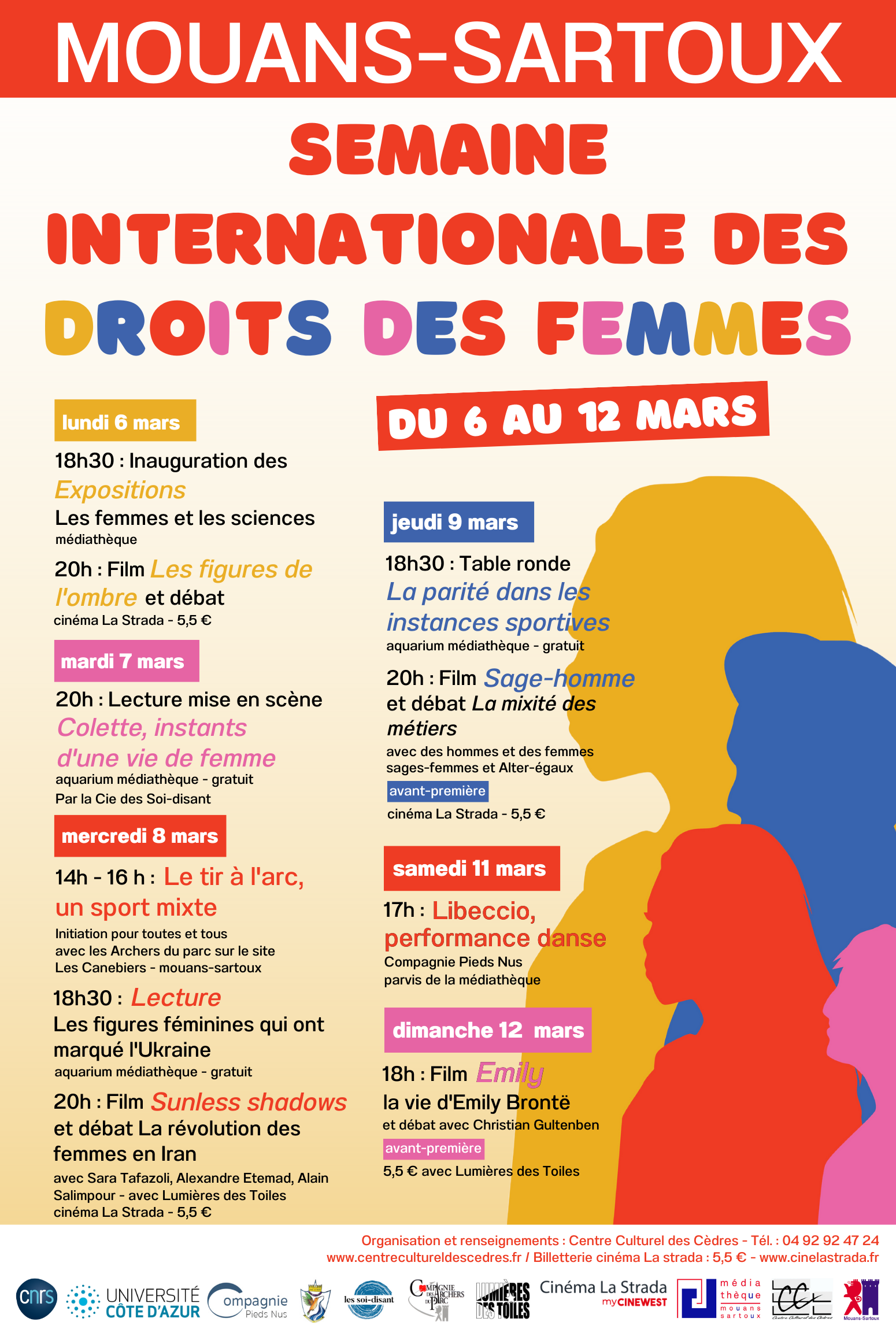 Aussi, nous organisons à Mouans-Sartoux depuis plusieurs années une SEMAINE internationale des Droits des Femmes avec la collaboration de nombreuses associations de Mouans-Sartoux qui contribueront chacune dans leur domaine : la Compagnie Pieds nus, la Compagnie des Soi disant, le cinéma La Strada, Lumières des toiles, la Médiathèque, le collège La Chênaie, les Archers du Parc, mais aussi L’Université de Nice, le CNRS, WHAT 06, Alter Egaux…