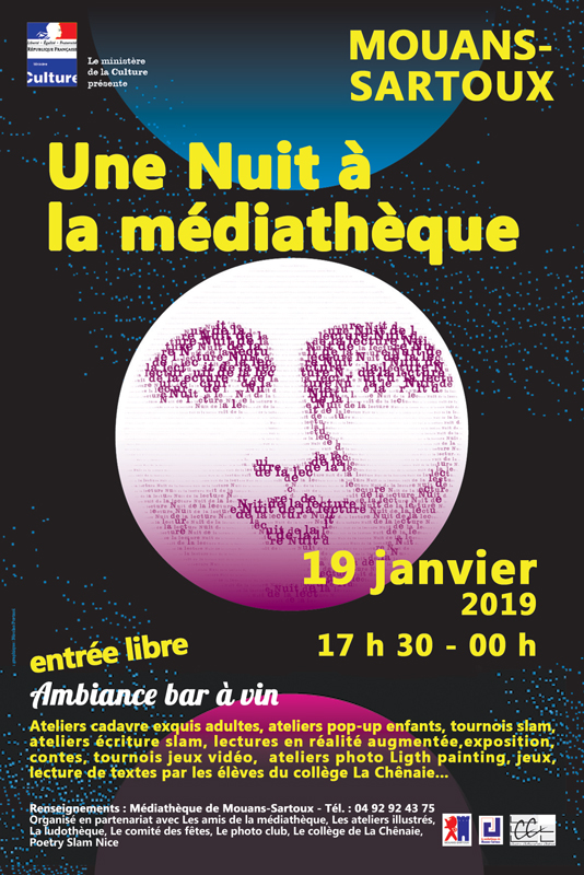 en partenariat avec Les amis de la médiathèque, Les ateliers illustrés, La ludothèque, Le comité des fêtes, Le photo club, Le collège de La Chênaie, Poetry Slam Nice